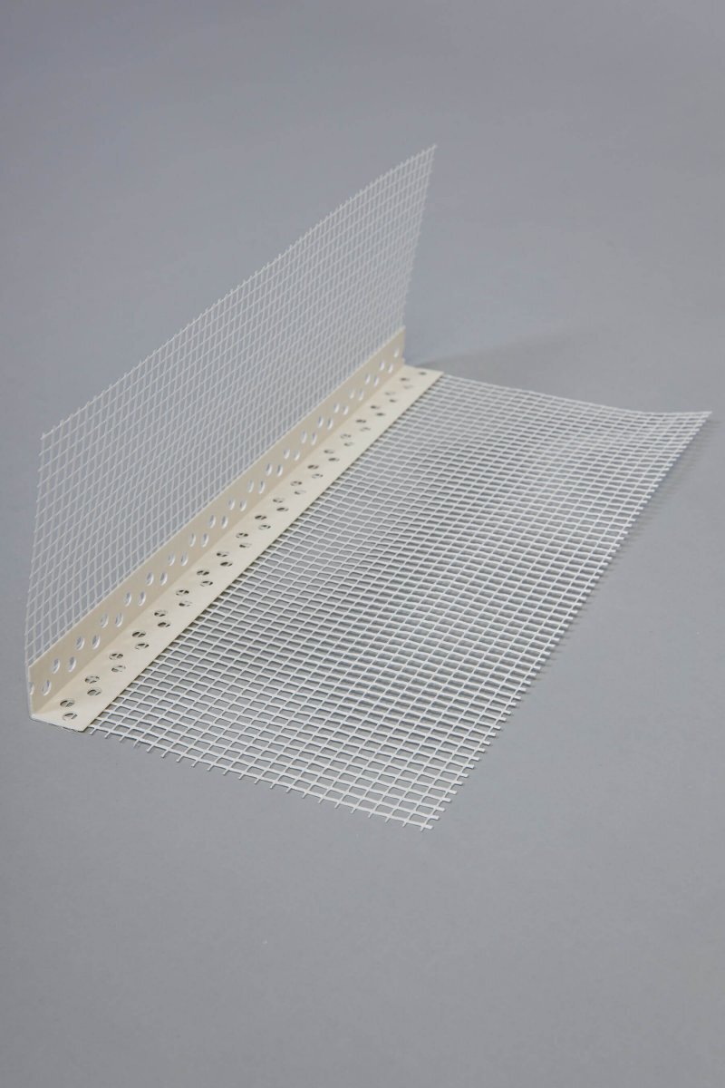 Профиль угловой с армирующей сеткой – это погонажное изделие, в состав которого входят склеенные между собой сердечник из ПВХ и армирующая сетка на основе стеклоткани.